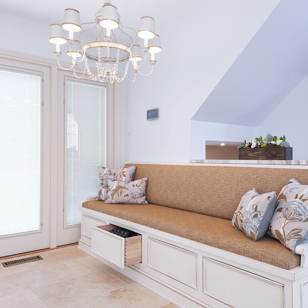 There are many amazing details such as wire mesh cabinet inserts with LED interior lighting, retractable lift-up doors for small kitchen appliances, and an opus blend travertine floor. The cabinetry and bench, built by Quality Custom Kitchens is all done in white with their artistic finish.
